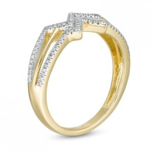 Crafted in warm 10K gold, this ring features a diamond-lined ribbon at the center. The polished ribbon completes the split, three-row setting. This ring features 1/8 carat diamonds polished to a brilliant shine for a bold statement.