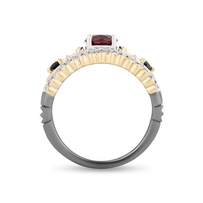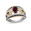 Crafted in two-tone sterling silver and 10K gold, this ring features an 8.0 x 6.0mm oval royal red garnet flanked by a sword-shaped black diamond center heart in warm gold. Gleaming white diamonds are set in a silver border along with a captivating black diamond and scalloped gold ribbon. A crown is set below the black rhodium plated setting to complete this royal look. This split setting style is so mesmerizing with 1 carat of diamonds and a brilliant polished shine that you will never imagine. This ring is only available in size 7.