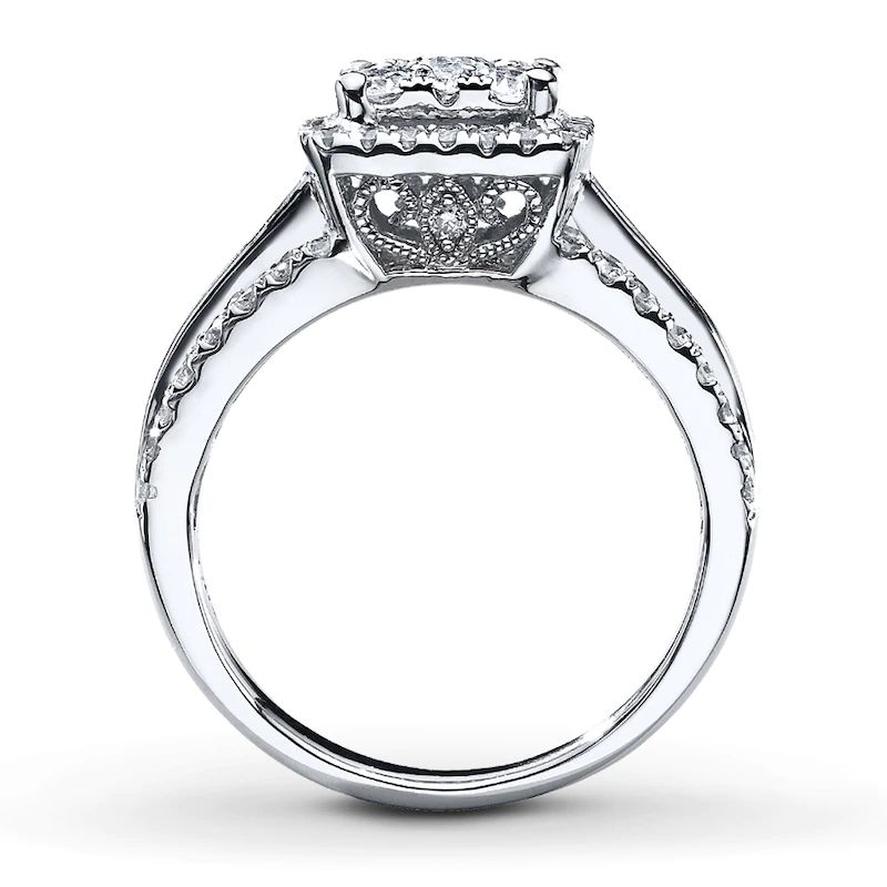 This fabulous bridal set for her features a round diamond enveloped in swirls of additional round diamonds at the center of the engagement ring. More round diamonds edge the 10K white gold band of the engagement ring and the matching wedding band. The bridal set has a total diamond weight of 3/4 carat.